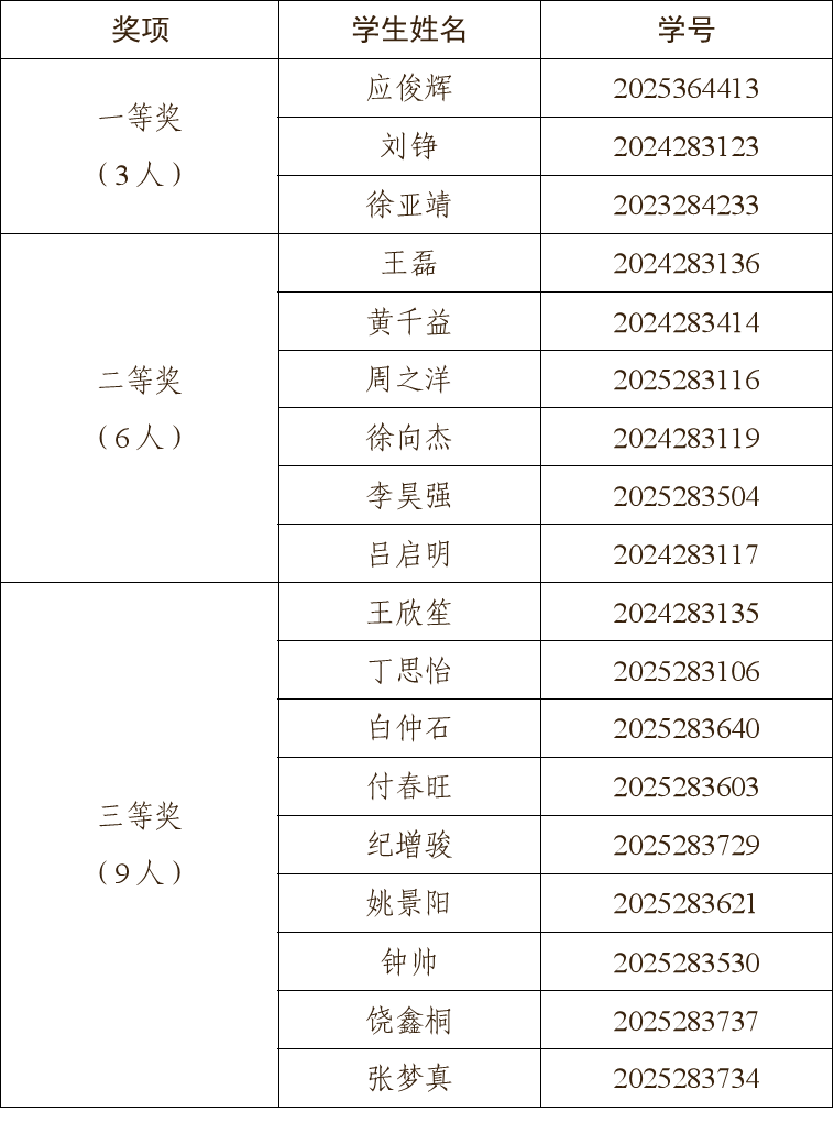 湖州学院2026年浙江省程序设计竞赛校内选拔赛已落下帷幕。本次比赛面向全校学生,共36人报名参赛。经竞赛组委会评定,共产生一等奖3项,二等奖6项,三等奖9项。具体名单如下: